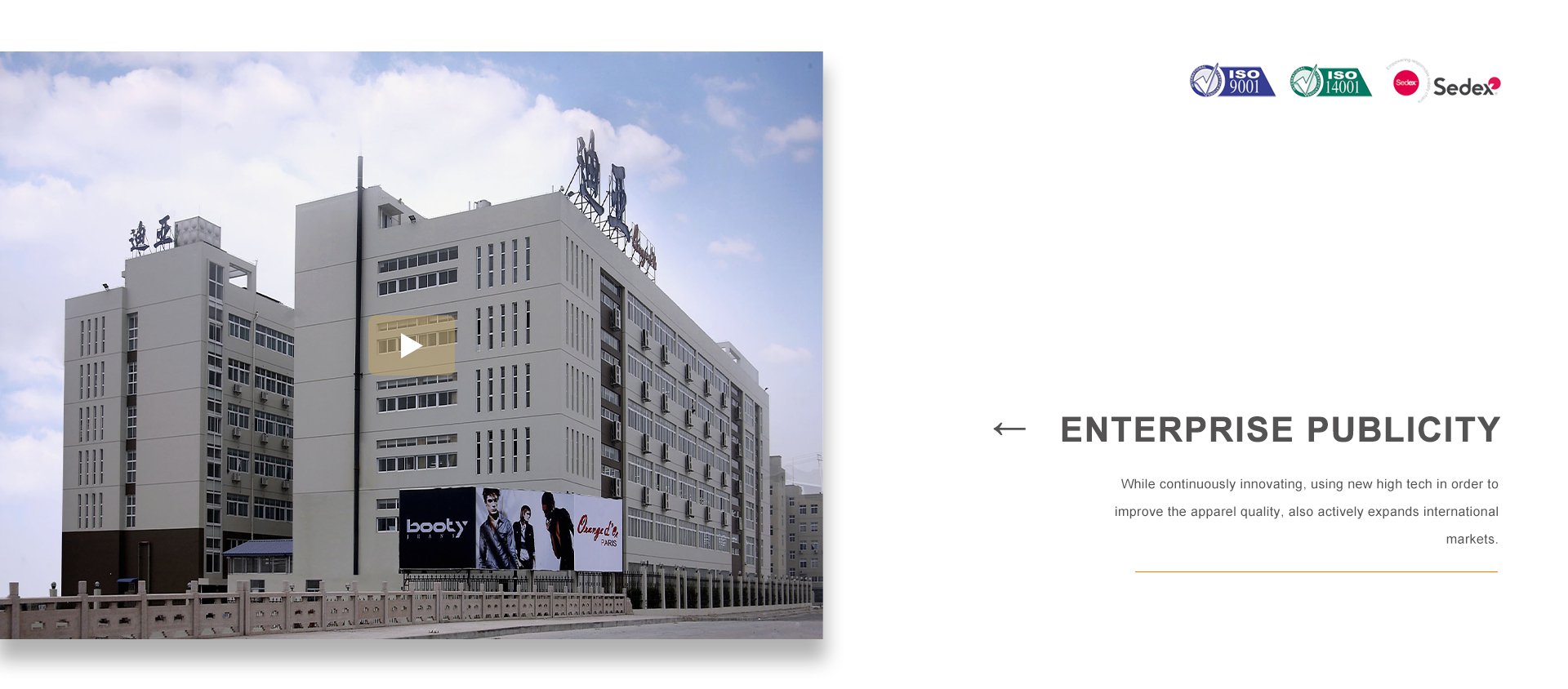 浙江迪亞服飾有限公司于1998年在世界時尚品牌之都——法國巴黎二區(qū)應運而生。同年,在浙江省甌海經(jīng)濟開發(fā)區(qū)東方南路28號設立服裝制造工廠。公司集服裝設計、生產(chǎn)、營銷、品牌于一體,在不斷創(chuàng)新、采用高新技術提高服飾質(zhì)量的同時,積極拓展國際市場,海外營銷部長期與LV集團旗下的MAJE、SOEUR、BALIBARIS等國際著名品牌保持非常緊密的合作關系。品牌建設是公司堅持不懈的追求,我們每年都會積極參加國內(nèi)外舉辦的各大服裝展銷會。憑借著良好的質(zhì)量與信譽,市場占有率在逐漸擴大,產(chǎn)品遠銷歐洲、美洲、亞洲等國。公司以生產(chǎn)棉衣、羽絨服、派克、大衣、夾克、運動休閑服飾等為主,旗下主打品牌有 ORANGE D’OR 、CLAIRVAL、BOOTY JEANS 、S&V和SASAEC,各品牌服飾均以典雅的色彩、優(yōu)美的線條、卓越的魅力吸引著都市麗人,將時尚、經(jīng)典的潮流信息予以淋漓盡致的演繹。